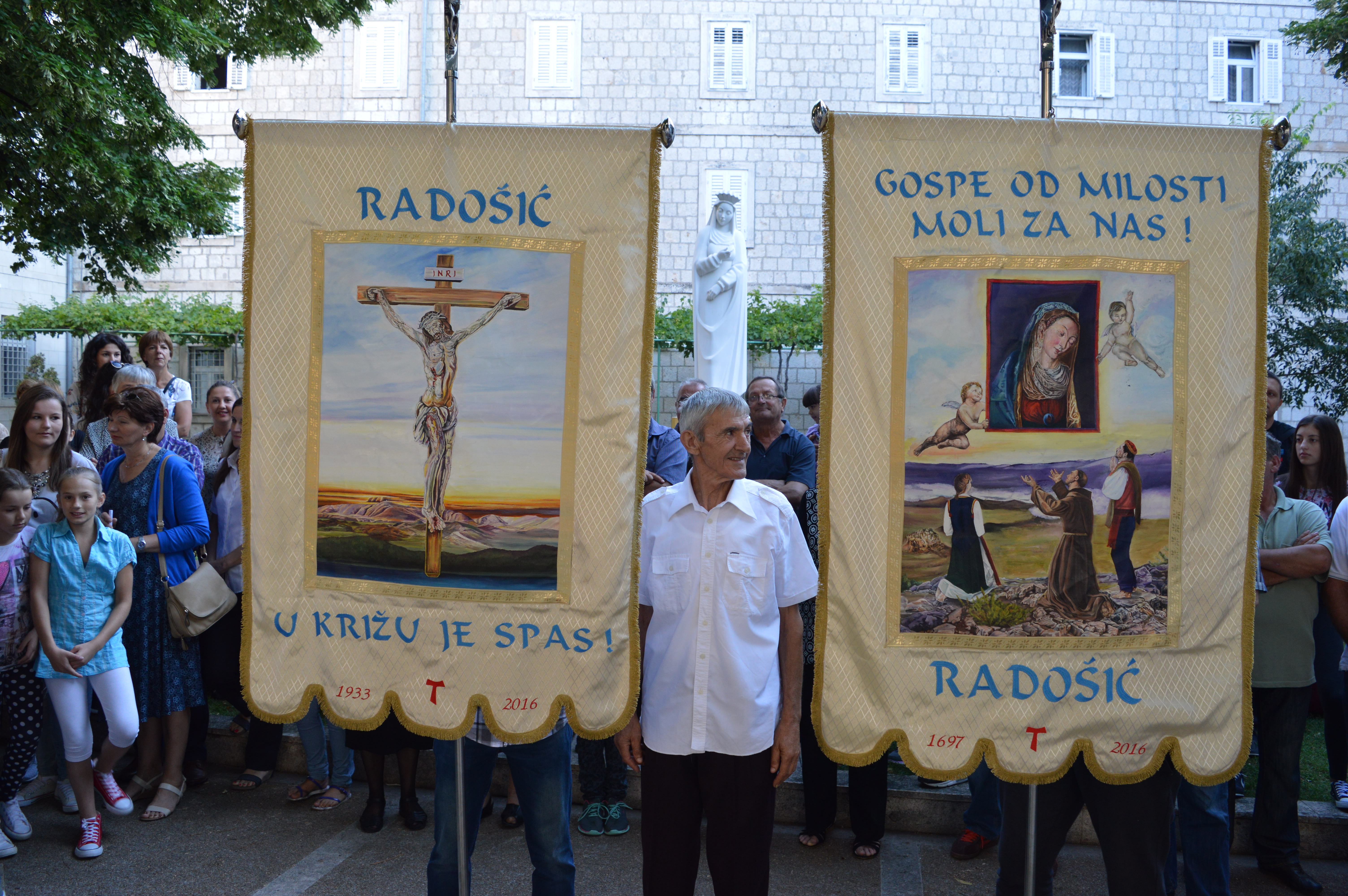 Prije početka procesije, sinjski župnik fra Perica Maslać u samostanskom dvorištu je blagoslovio dva nova barjaka Radošića, koji prikazuju važne trenutke vjerničkog života ljudi s Radošića, a posebno se ističu motivi križa i slike Majke od Milosti, koji jasno upućuju na stoljetnu povezanost Radošićana s milosnim likom Gospe Sinjske te njihovu privrženost križu Gospodinovu, kojeg postaviše u novije vrijeme na obližnje brdo Visoka (890 m), kao neprestanu poruku svim putnicima i namjernicima da je samo "u križu spas". Nakon blagoslova barjaka filijale Radošić, vjernicima je u prigodnim liturgijskim uputama približen nauk i uvjeti za zadobivanje potpunog oprosta vremenite kazne za počinjene grijehe, kojeg svaki katolik može zadobiti i u sinjskom svetištu za vrijeme trajanja "Godine milosrđa".