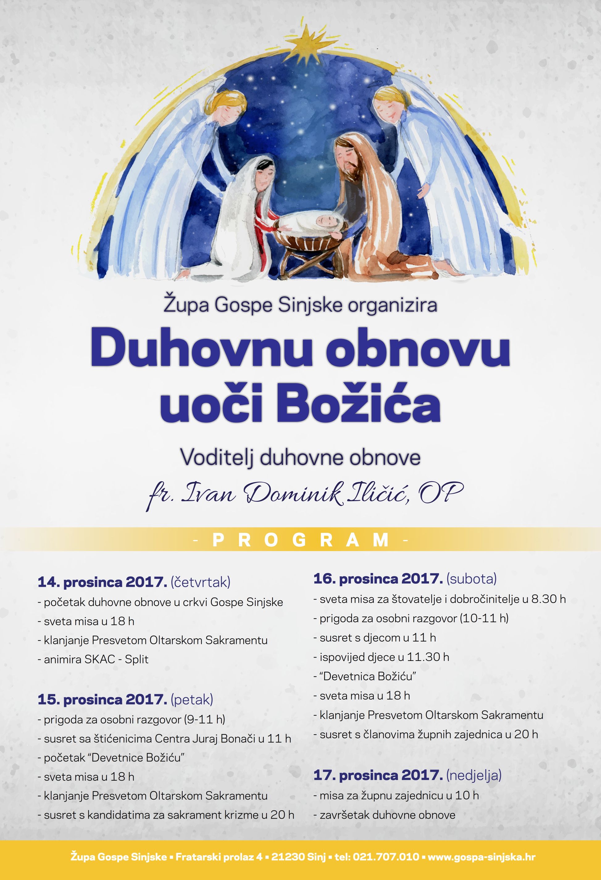 Na treću nedjelju došašća, 17. prosinca 2017., završila je četverodnevna duhovna obnova za župnu zajednicu u Sinju. Voditelj obnove bio je dominikanac Ivan Dominik Iličić, a sudjelovalo je nekoliko stotina Sinjana. Župa Gospe Sinjske tijekom liturgijske godine organizira nekoliko puta duhovne obnove, pod organizacijskim vodstvom župnika fra Perice Maslaća, župnih vikara i pastoralnih suradnika.
