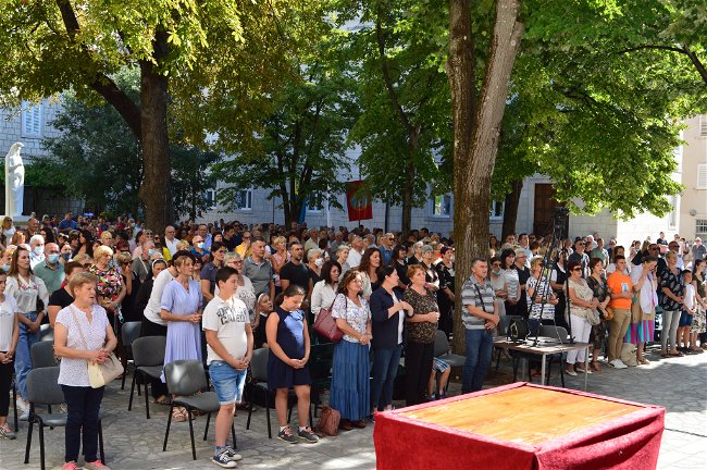 Dvorište Svetišta ispunjeno vjernicima koji u tišini i skrušenosti čekaju zvuk zvona, koji pozivaju za početak svete mise.