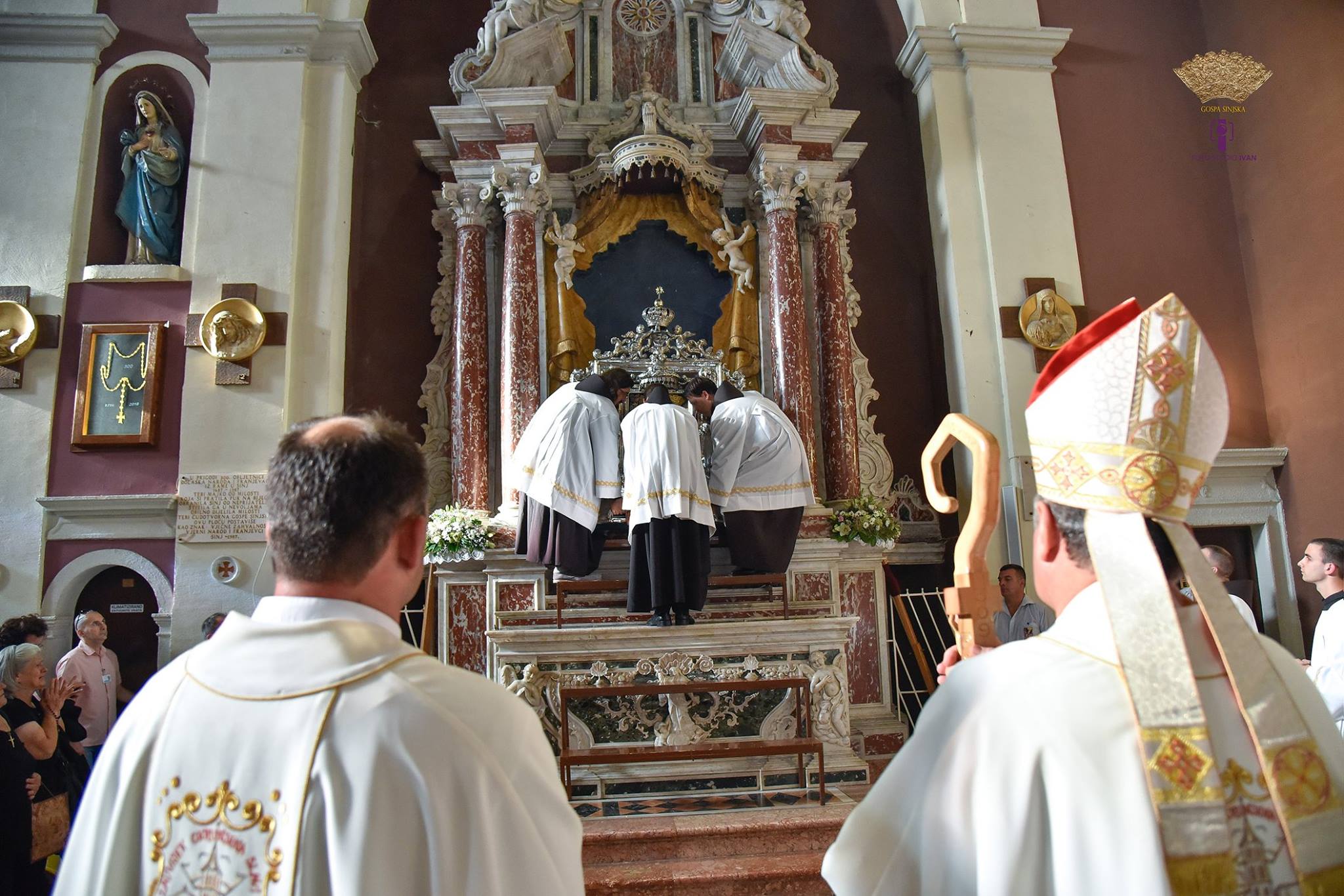 Nakon što je slika Gospe Sinjske položena na za to pripravljeno mjesto kod vanjskog oltara, fra Antonio je otpjevao „Pohvale Čudotvornoj Gospi Sinjskoj“, staro-drevnu pjesmu koja pripovijeda svetu povijest Slike, Sinja i franjevaca. Potom je mons. Košić poveo pjesan „Slava Bogu na visini“. Evanđelje od Mise bdijenja navijestio je fra Perica. Predsjedatelj je u propovijedi istakao svoju radost što kao hodočasnik može stupiti pred milosni lik Gospe Sinjske i biti učenik u Njezinoj školi. Istakao je da smo i mi „pozvani odgovoriti svojim pristankom na Božju volju da Gospodin može doći i k nama i sklopiti s nama svoj vječni savez. Ključ je u pristanku, u prihvaćanju. Marija je imala povjerenja u Boga i prihvatila je što je on tražio, a mi se često ispričavamo raznim izlikama jer nemamo dovoljno povjerenja. Zato je Marija naša učiteljica, mater et magistra, ona nas svojim primjerom poučava da se otvorimo Bogu i njegovim planovima s nama.“ Protumačivši naziv „kovčeg novoga saveza“, o. Biskup naglasio je da se upravo u Marijinoj poslušnosti ogleda Njezino blaženstvo. Zaključio je da ona „želi da i svi mi pođemo u njezinu školu te prijeđemo iz raspadljivosti u neraspadljivost, iz smrti u besmrtnost. Gospo Sinjska, moli za nas, za svakoga od nas koji te častimo i tebi se utječemo! Moli za naše obitelji, za otvorenost radosti života! Moli za ovu sinjsku krajinu i našu domovinu Hrvatsku jer ti si naša Najvjernija majka i Odvjetnica Hrvatske, ti si Kraljica Hrvata, Duša duše hrvatske, Gospe Sinjska, naša mati!“ Cijelu propovijed možete pročitati na ovoj poveznici - klikni.