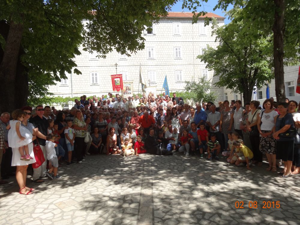Današnje hodočašće imalo je različit tijek događanja od dosadašnjih. Nakon što su vjernici pristigli u Svetište (jedan broj i pješke) pristupili su sakramentu svete ispovijedi a zatim su u crkvi u moljenju krunice, koju je predmolio don Stipe, čekali povratak Gospine slike s Grada. Naime, jučer je Gospina Slika, nakon vojnog hodočašća u procesiji odnesena u crkvu na Gradu, gdje je bilo cijelo-noćno bdijenje. Danas, 2. kolovoza, na Gradu je sv. misu slavio naš nadbiskup mons. Marin Barišić, a poslije mise, u svečanoj procesiji Gospina slika je vraćena u crkvu.