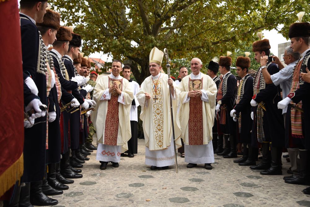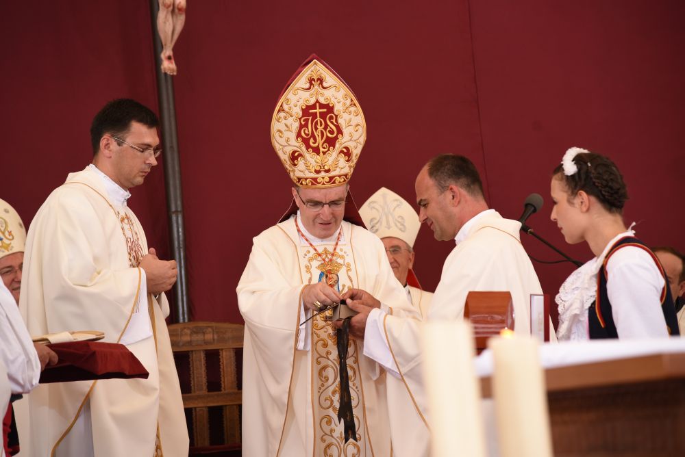 Na kraju misnog slavlja riječ zahvale je uputio provincijal Franjevačke Provincije Presvetog Otkupitelja fra Joško Kodžoman, koju možete pročitati OVDJE. Na kraju zahvalnih riječi uručio je poklon Kardinalu, Mitru i zlatnik Gospe Sinjske.