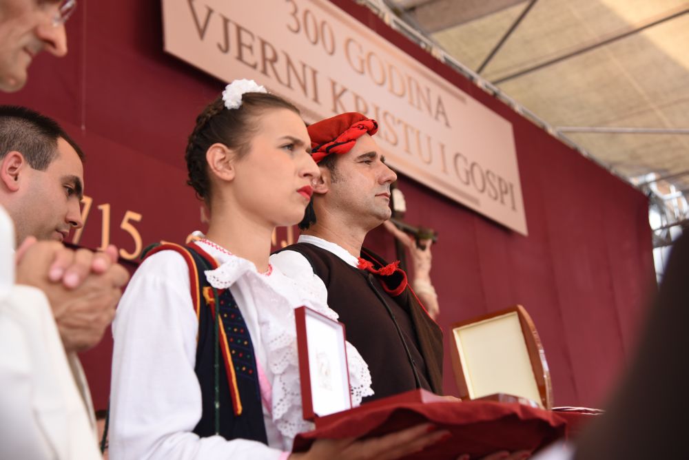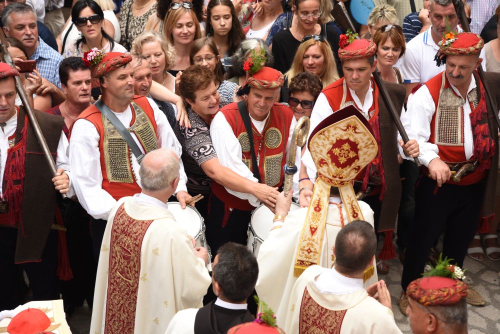 Otac Kardinal se zahvalio o. Provincijalu na primljenom daru, i prije blagoslova uputio riječ zahvale: „Draga braćo i sestre, mogu reći hvala, hvala za vašu vjeru, za vaše svjedočenje. Treba doći u Sinj na Veliku Gospu i ući u Svetište i vidjeti redove za ispovijed, sudjelovati u procesiji i slaviti Svetu misu … tek tu možemo osjetiti dušu i identitet ovog naroda. Ja zahvaljujem i čestitam … budite ponosni na ono što jeste. Čuvajte to i razvijajte, samo tako će preživjeti ovaj narod, ovaj puk hrvatski. Provincijal me iznenadio s ovim poklonom, ali treba biti ponizan i primiti poklon. Ovo je znak kako se stvara naša kulturna baština. Primam to kao Papin izaslanik i kao zagrebački nadbiskup … to će ostati u crkvi, u riznici i stoljećima nakon će se vidjeti kako se ovdje odvijalo veličanstveno slavlje. Kao Papin izaslanik predajem medalju svetoga Pape Ivana Pavla II. Ivan Pavao II je zadužio hrvatski narod i mi ćemo mu uvijek ostati zahvalni, u njemu imamo zagovornika na nebu.