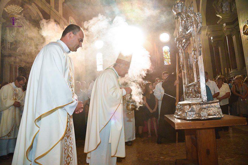 Teško je pronaći riječi kojima bi se opisao svečani prolazak Gospine slike kroz vjerni narod, koji je sa suzama u očima upravljao poglede prema Majci od Milosti, a mnogi su nastojali rukom dotaknuti Njezinu priliku. Po dolasku na Trg dr. Franje Tuđmana, bogoslovi su postavili Svetu priliku na vanjski oltar, a fra Antonio je ispjevao "Pohvale Čudotvornoj Gospi Sinjskoj", koje govore o povijesti dolaska Slike u Sinj i slavnoj pobjedi pod Sinjem 1715. god. Mons. Bogdan je znakom križa započeo euharistijsko slavlje, koje se preko razglasa moglo čuti u cijeloj crkvi, samostanu, dvorištu, Trgu te obližnjim ulicama. Evanđelje od Mise bdjenja navijestio je fra Perica. Vojni ordinarij je propovijedao kršćanski nauk o čovjeku, Crkvi te o stvarnostima poslije smrti, posebno naglasivši da je veliko zlo borba protiv malih, tek začetih i uopće borba protiv novog života - sprječavanje začeća svim sredstvima, to je i naše veliko zlo, koje sije smrt i donosi veliku pustoš, prokletstvo. Kakova se to i kolika kriza duha dogodila da se tako i toliko žilavo opiremo životu? Što li sve čovjek nije učinio i poduzeo da bi spriječio začeće i rođenje novog života? Što se to s nama događa da začetu djecu ne vidimo više kao blagoslov nego kao teret? Kojoj smo se to ideologiji smrti priklonili? - zapitao se biskup. (cijelu propovijed možete pročitati na poveznici - klikni).