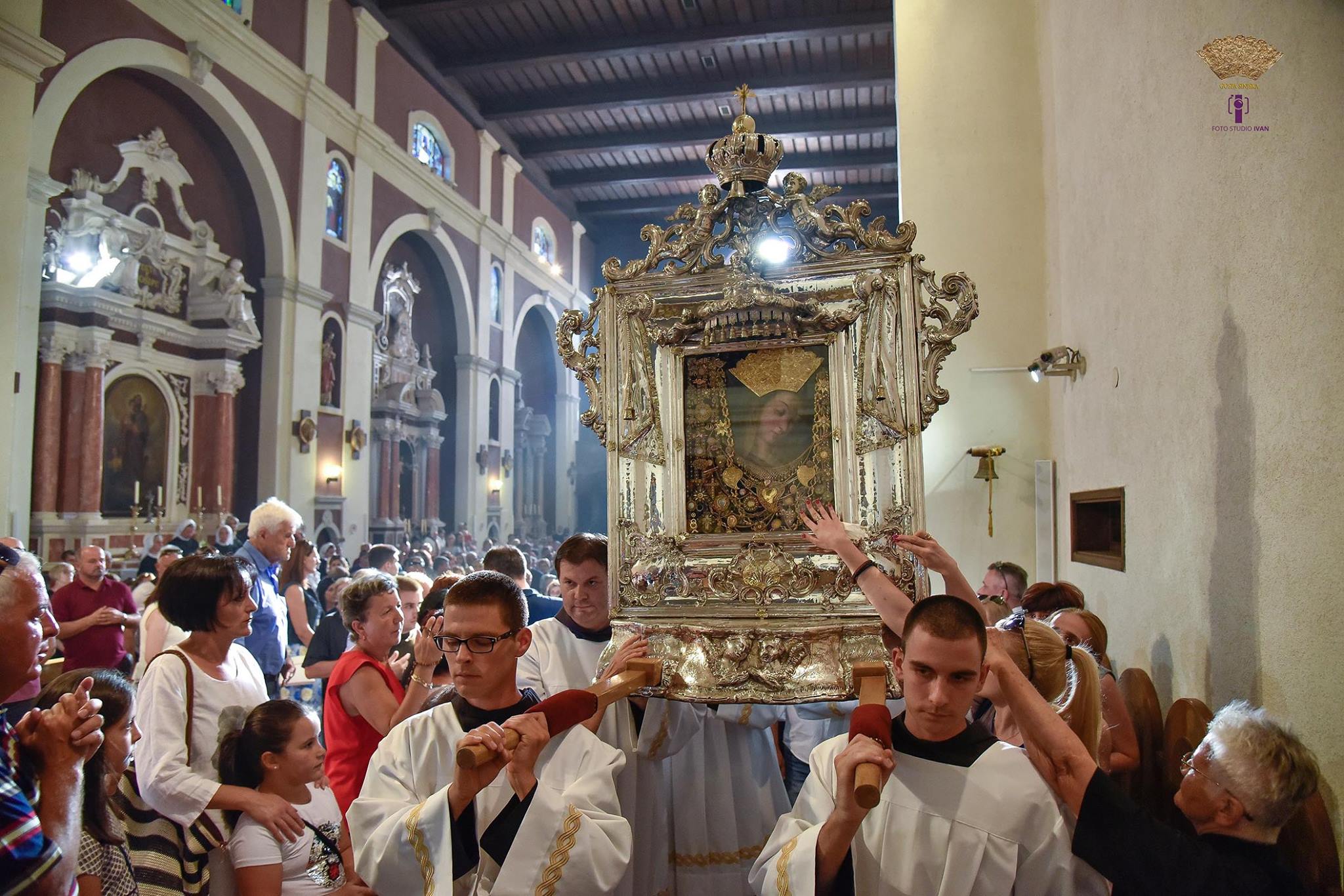 U predvečerje Njezina slavlja, Sinjani i njihovi dragi gosti obnovili su zavjet vjernosti Bogu i Gospi. Slavlje je započelo sviranjem fanfara i svečanim zvucima zvona, koji su cijelom gradu označili da franjevci skidaju srebreni okvir s neprocjenjivim blagom, biserom i najljepšim uresom Cetinskog kraja, a to je slika Čudotvorne Gospe Sinjske. Kao i svake godine, trojica franjevaca sudjeluju u samom skidanju Slike, a ove godine ta čast je pripala fra Ivanu Čikari, fra Josipu Repeši i fra Ivanu Novakoviću. Nezaboravan trenutak u srcu prisutnih vjernika, od kojih bi svaki rado dotakao Gospinu priliku. Gospina je slika, okićena zlatom, srebrom i biserjem, načas položena pred oltarom, kako bi joj i svećenstvo iskazalo svoju počast. Prvi među njima je mons. Vlado Košić, sisački biskup, koji je ove godine predsjedao slavljem Vigilije. Koncelebrirao je fra Joško Kodžoman, provincijal Franjevačke provincije Presvetog Otkupitelja, fra Petar Klapež, gvardijan i upravitelj Svetišta, fra Perica Maslać, župnik i samostanski vikar, don Marko Medo, biskupski vikar za pastoral u MORH-u, i fra Frano Delić. Obredničar kod slavlja je bio fra Antonio Mravak, a koordinator procesije fra Boris Čarić. Asistirali su bogoslovi i sjemeništari. Nakon što je mons. Košić pokadio sliku Gospe Sinjske, krenula je procesija preko samostanskog dvorišta prema Trgu dr. Franje Tuđmana, gdje se već tradicionalno na svetkovinu slave vanjska misna slavlja. Put iz crkve do vanjskog oltara još je jednom pokazao pobožnost muškaraca i žena, djece i mladih, prema Majci od Milosti, jer su svi željeli barem dotaknuti srebrni okvir. Sliku prema običaju nose franjevački bogoslovi.
