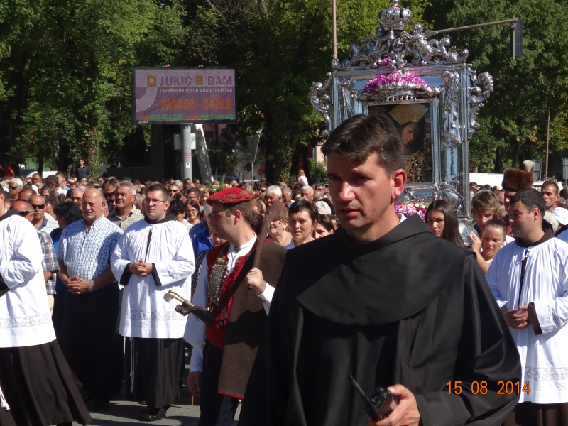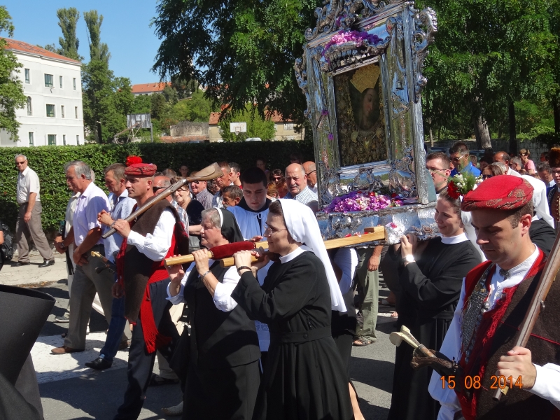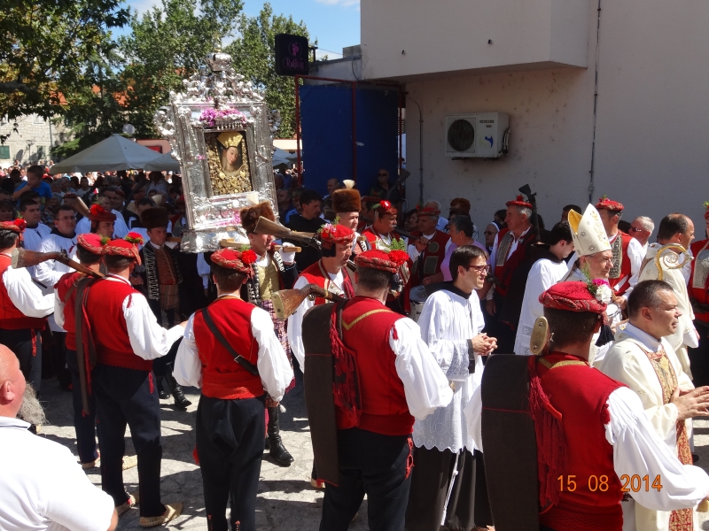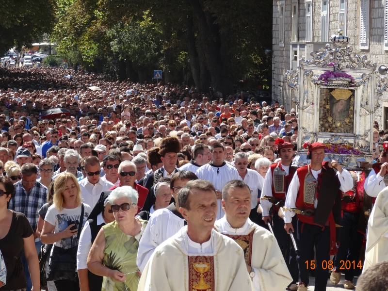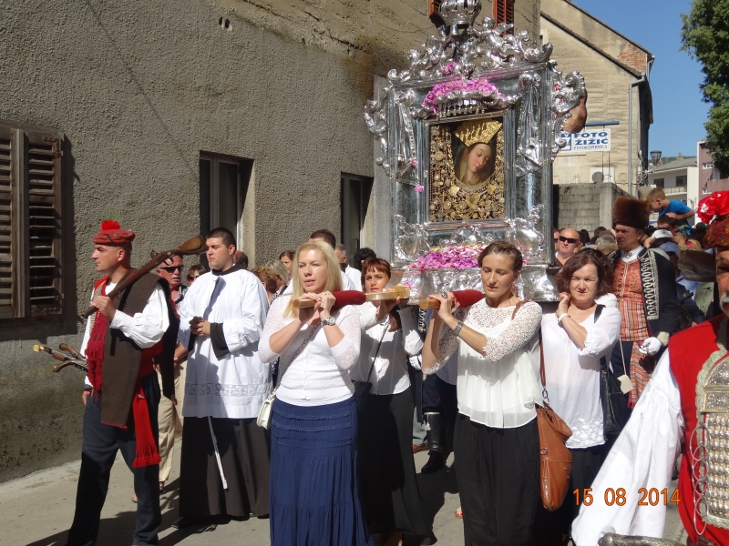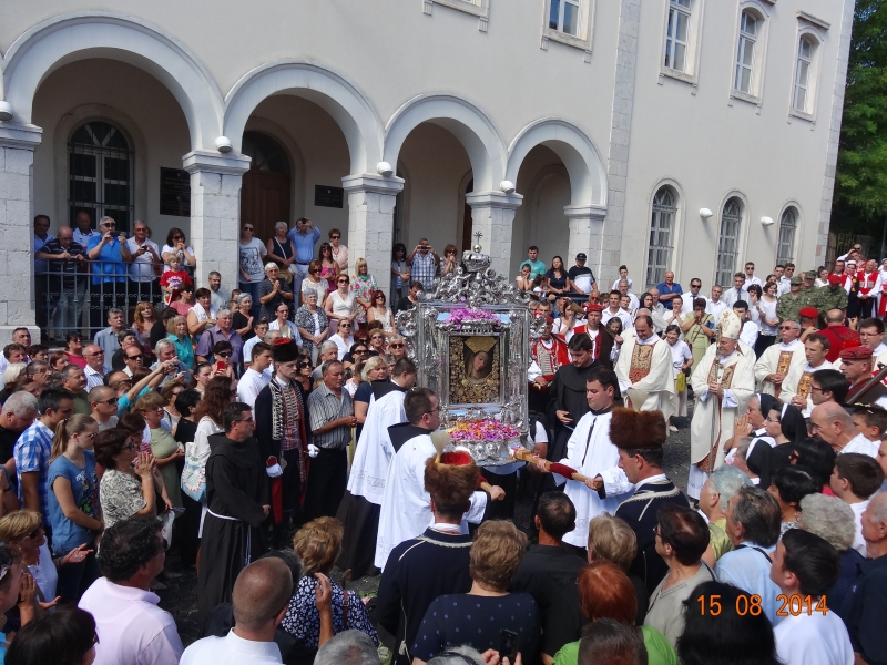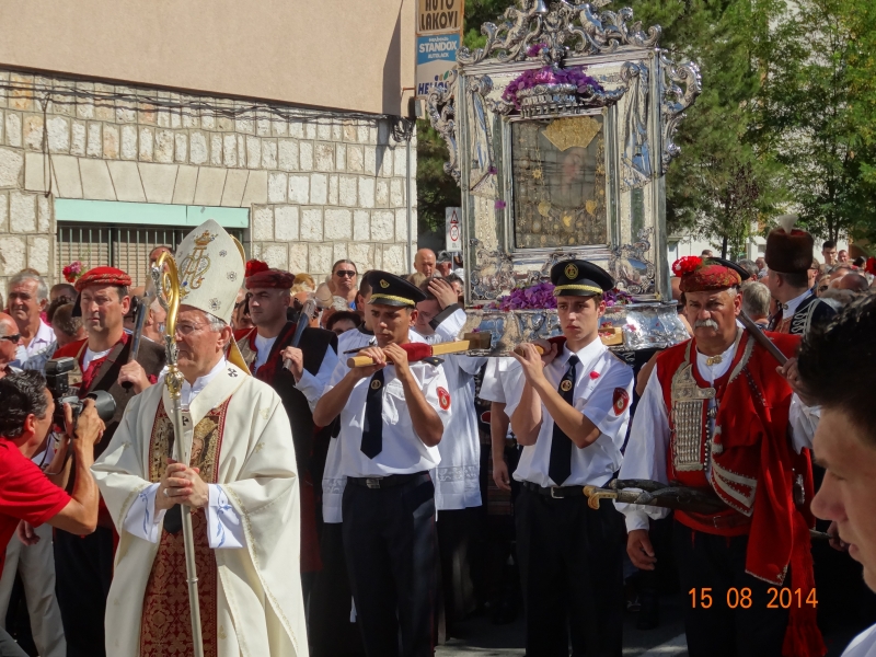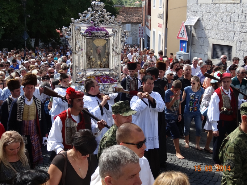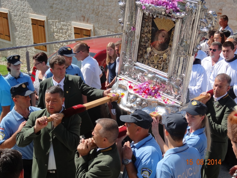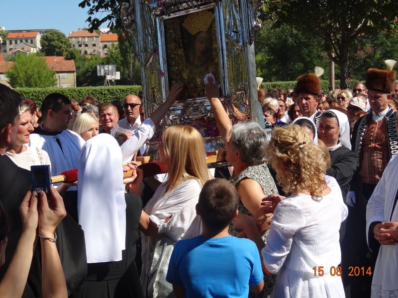 Slavljenje zvona i sviranje fanfara u 9.30 sati označilo je skidanje Slike Gospe Sinjske i slavlje svetkovine Uznesenja blažene Djevice Marije na nebo - Velike Gospe u Sinju 15. kolovoza 2014. godine pod motom "Čuvaj naše obitelji, Marijo mati, mole te tvoji vjerni Hrvati!"