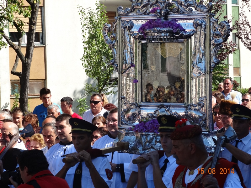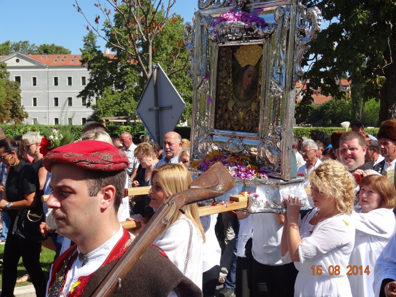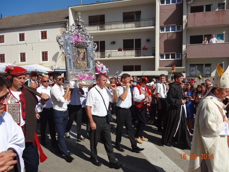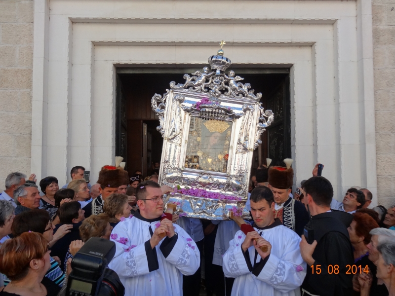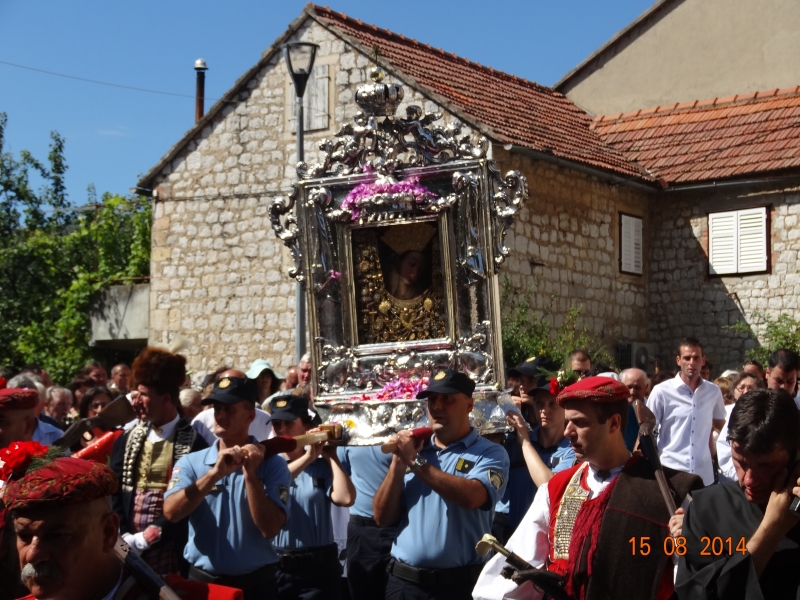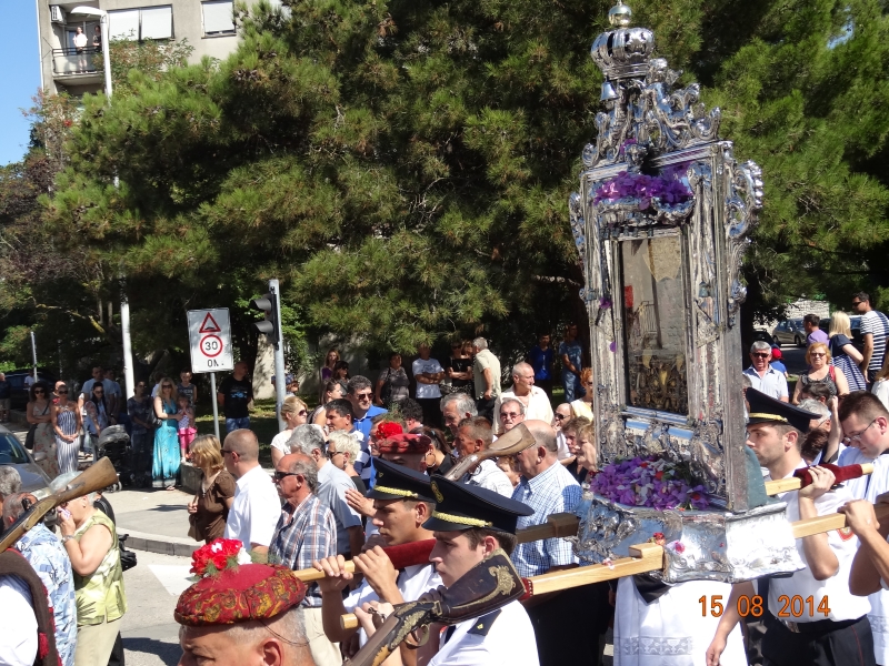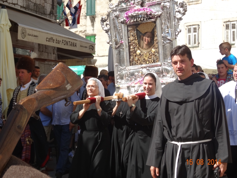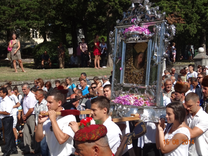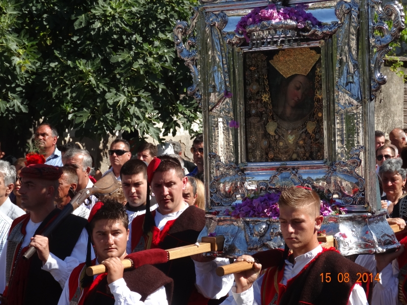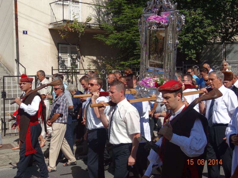 Slavljenje zvona i sviranje fanfara u 9.30 sati označilo je skidanje Slike Gospe Sinjske i slavlje svetkovine Uznesenja blažene Djevice Marije na nebo - Velike Gospe u Sinju 15. kolovoza 2014. godine pod motom "Čuvaj naše obitelji, Marijo mati, mole te tvoji vjerni Hrvati!"