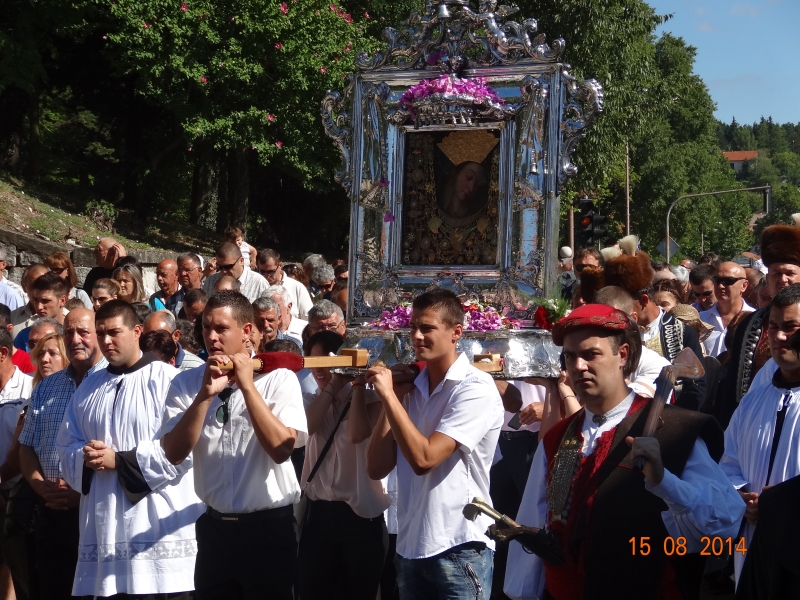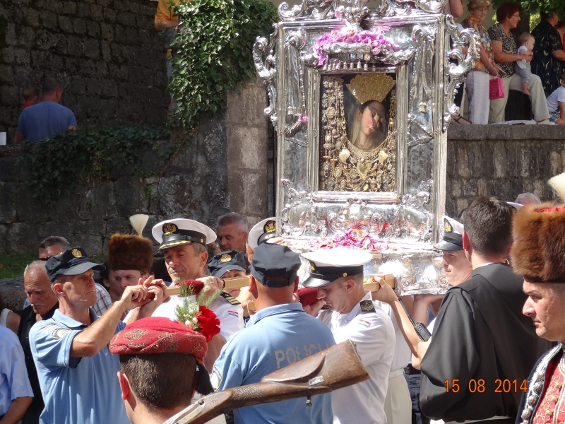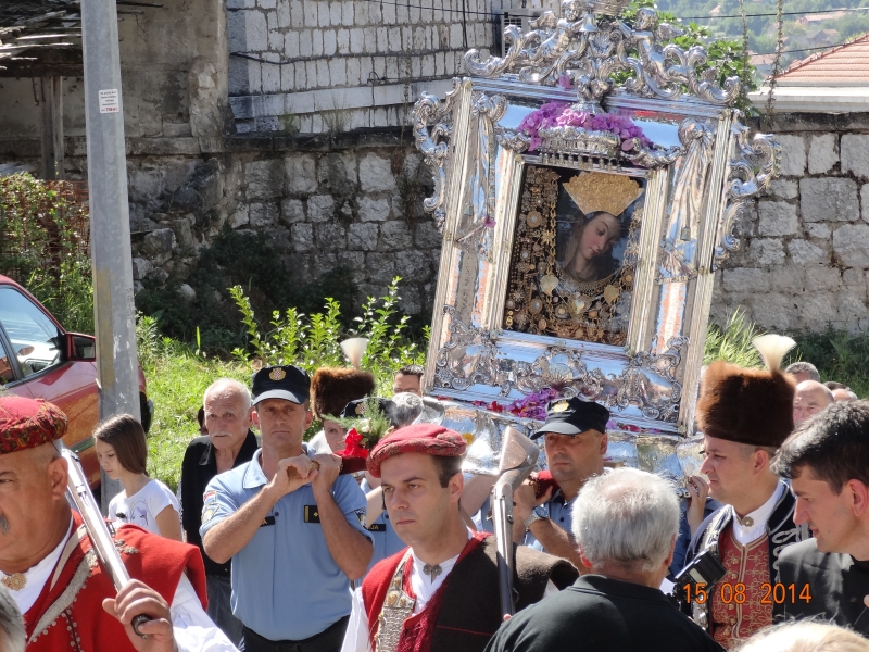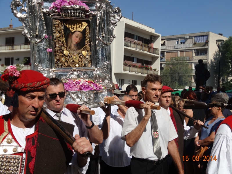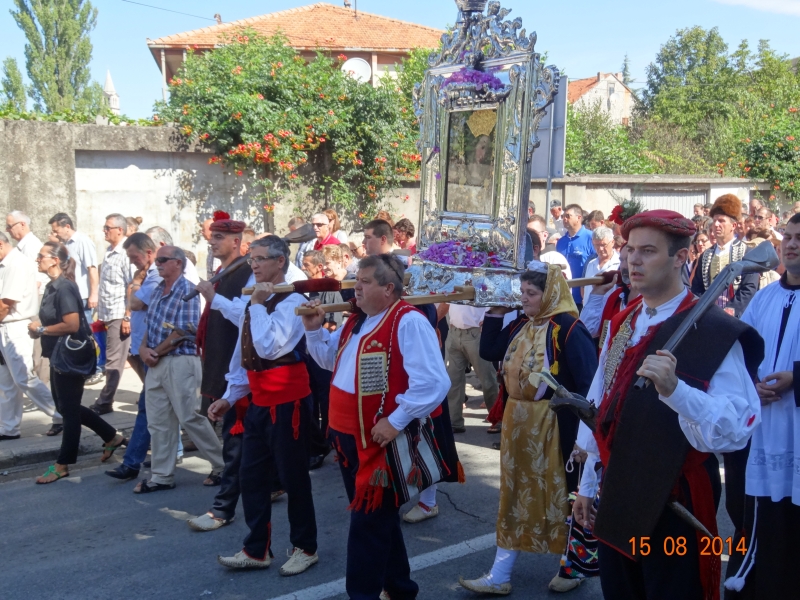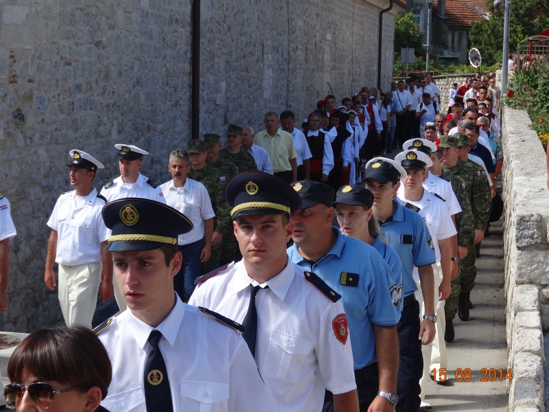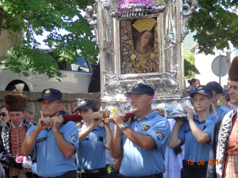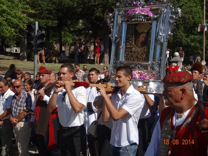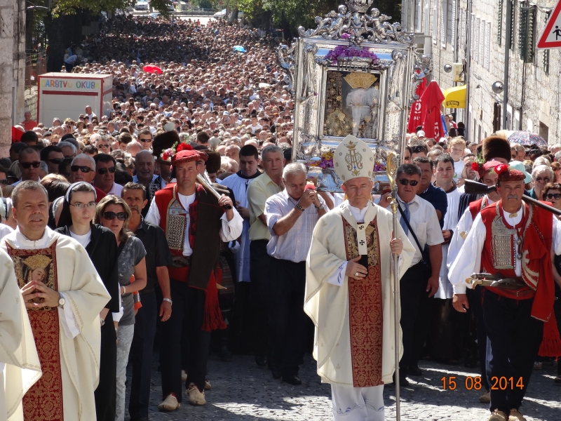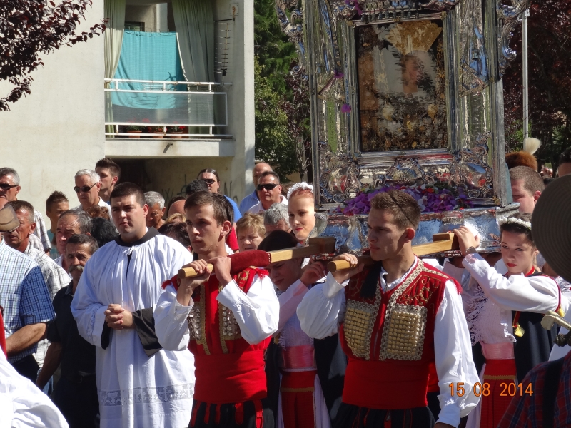 Slavljenje zvona i sviranje fanfara u 9.30 sati označilo je skidanje Slike Gospe Sinjske i slavlje svetkovine Uznesenja blažene Djevice Marije na nebo - Velike Gospe u Sinju 15. kolovoza 2014. godine pod motom "Čuvaj naše obitelji, Marijo mati, mole te tvoji vjerni Hrvati!"
