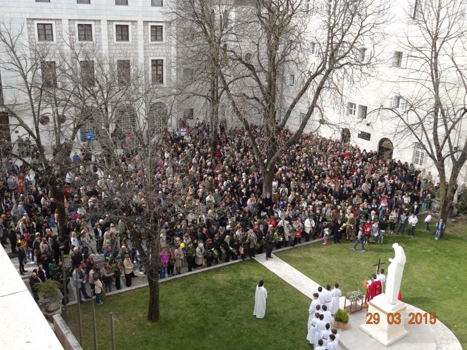 Cvjetnica je dan koji na poseban način pokreće vjernike, posebno zbog znakovitog blagoslova maslinovih grančica i čitanja Muke Gospodnje. Tako je bilo i danas na svim misama u našoj župi. Posebno je bio znakovit blagoslov prije župske mise, kada se u dvorištu okupio veliki broj vjernika. Župsku misu predslavio je župnik fra Ante a s njim je koncelebrirao i gvardijan fra Petar. Muku je pjevao fra Antonijo Mravak uz zbor Gospe Sinjske pod ravnanjem fra Jure Župića i orguljašice s. Jelene Mijić.